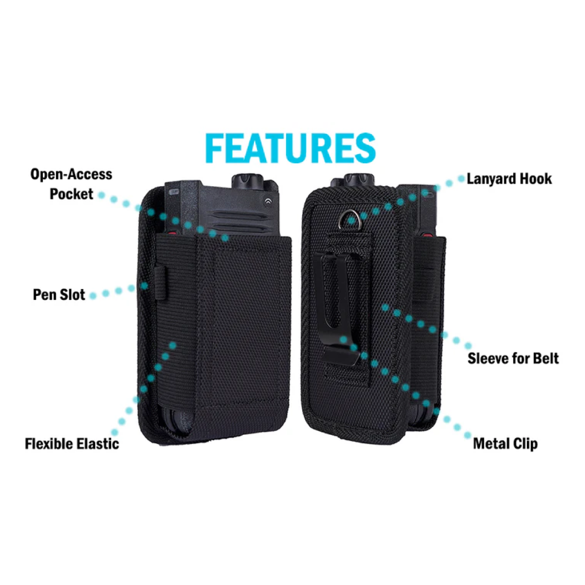 Key Features: Heavy-duty nylon construction, strong magnetic flap closure, vertical fixed belt clip, soft inner lining for screen protection, precise fit for Kyocera DuraXV Extreme, CAT S22, and Sonim XP3plus 5G, rugged outdoor-friendly design, secure and comfortable belt attachment.