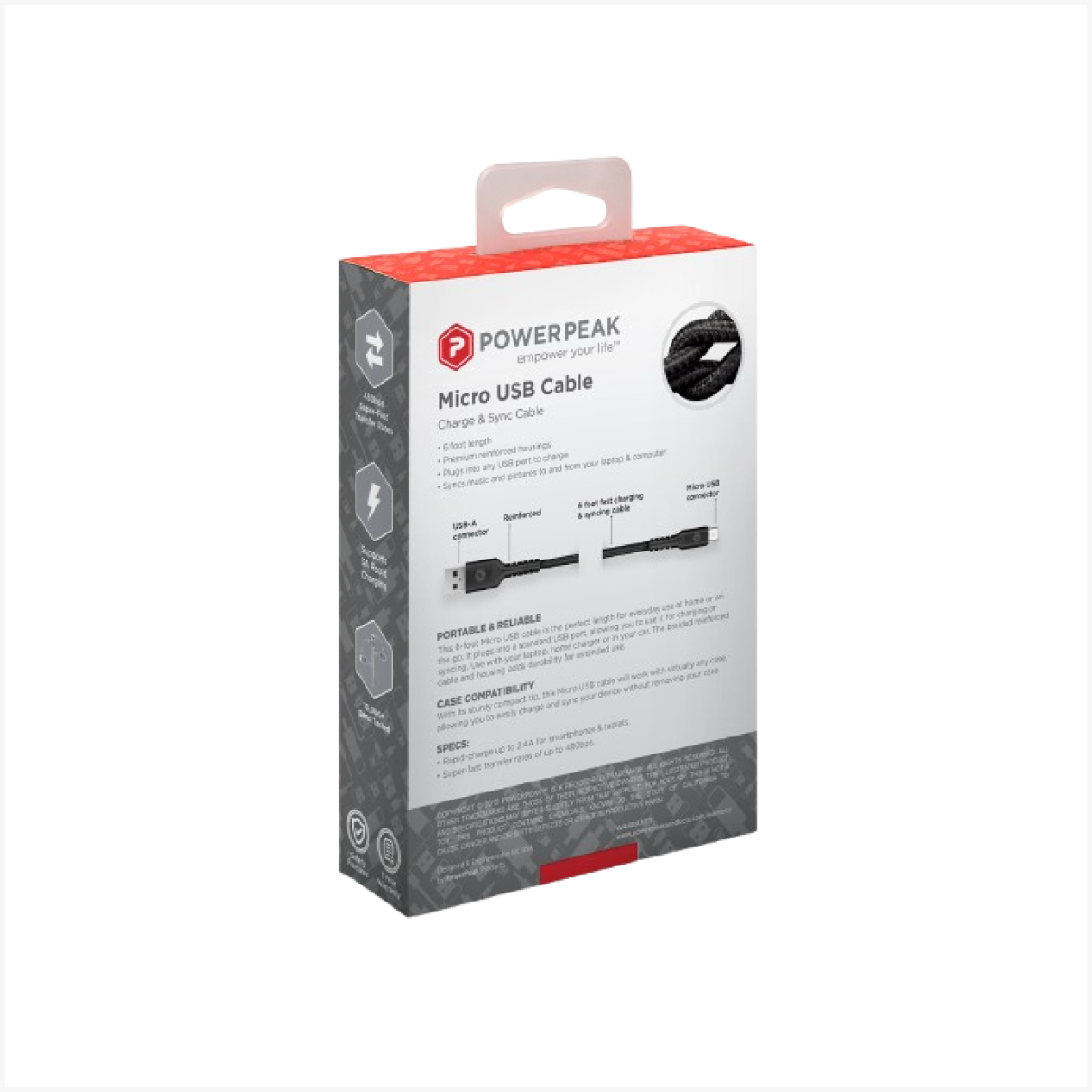 Charge and sync your devices with durability and speed using the PowerPeak 6ft. Braided Nylon Metallic Micro USB Cable. Designed for everyday use with a sleek black finish and reinforced build.