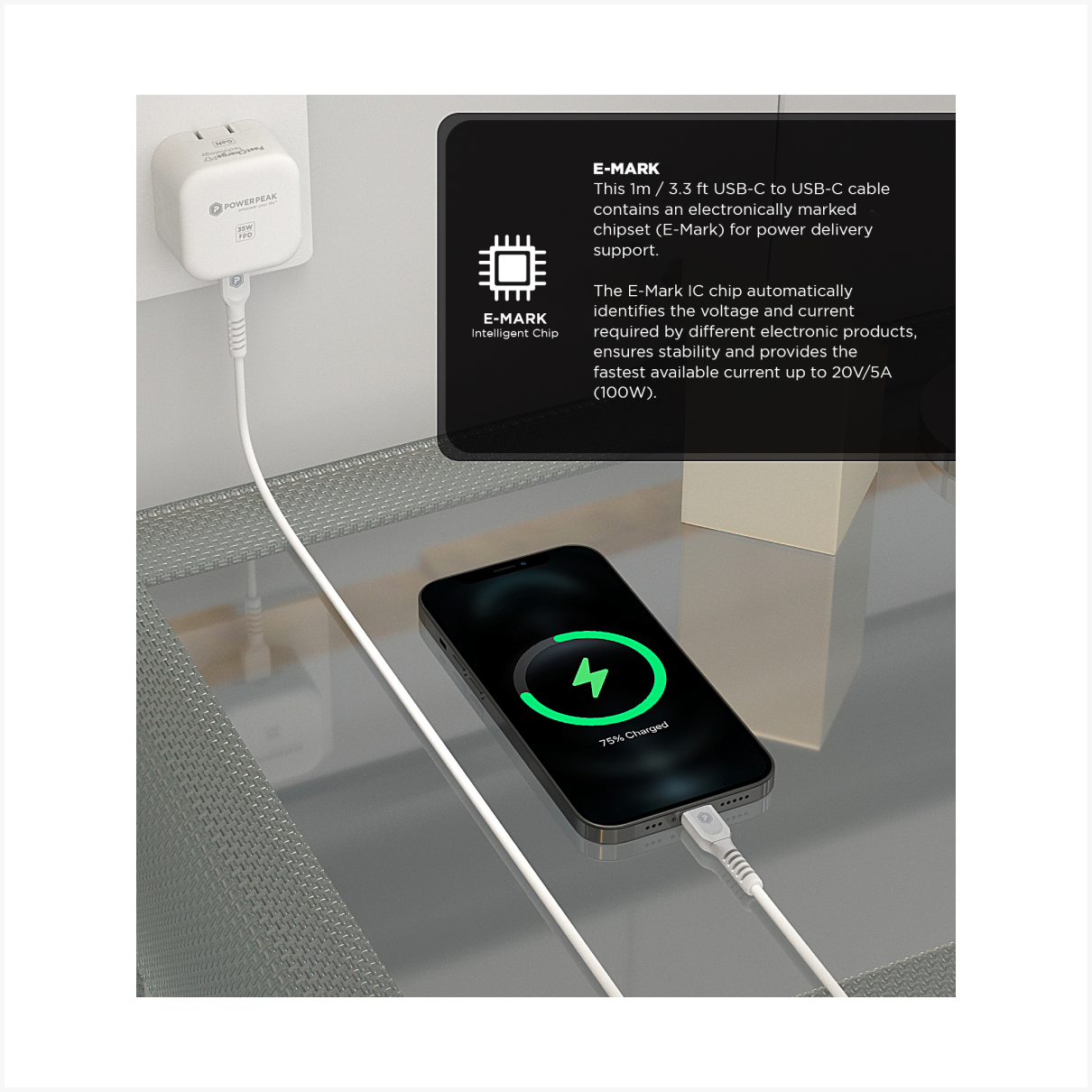 PowerPeak Type C to C 100w Charge, Sync Cable 6Ft -White