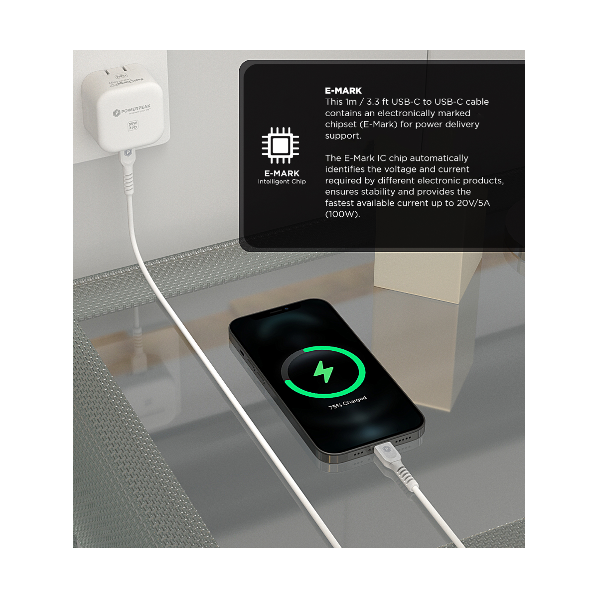 PowerPeak Type C to C 100w Charge, Sync Cable 6Ft -White
