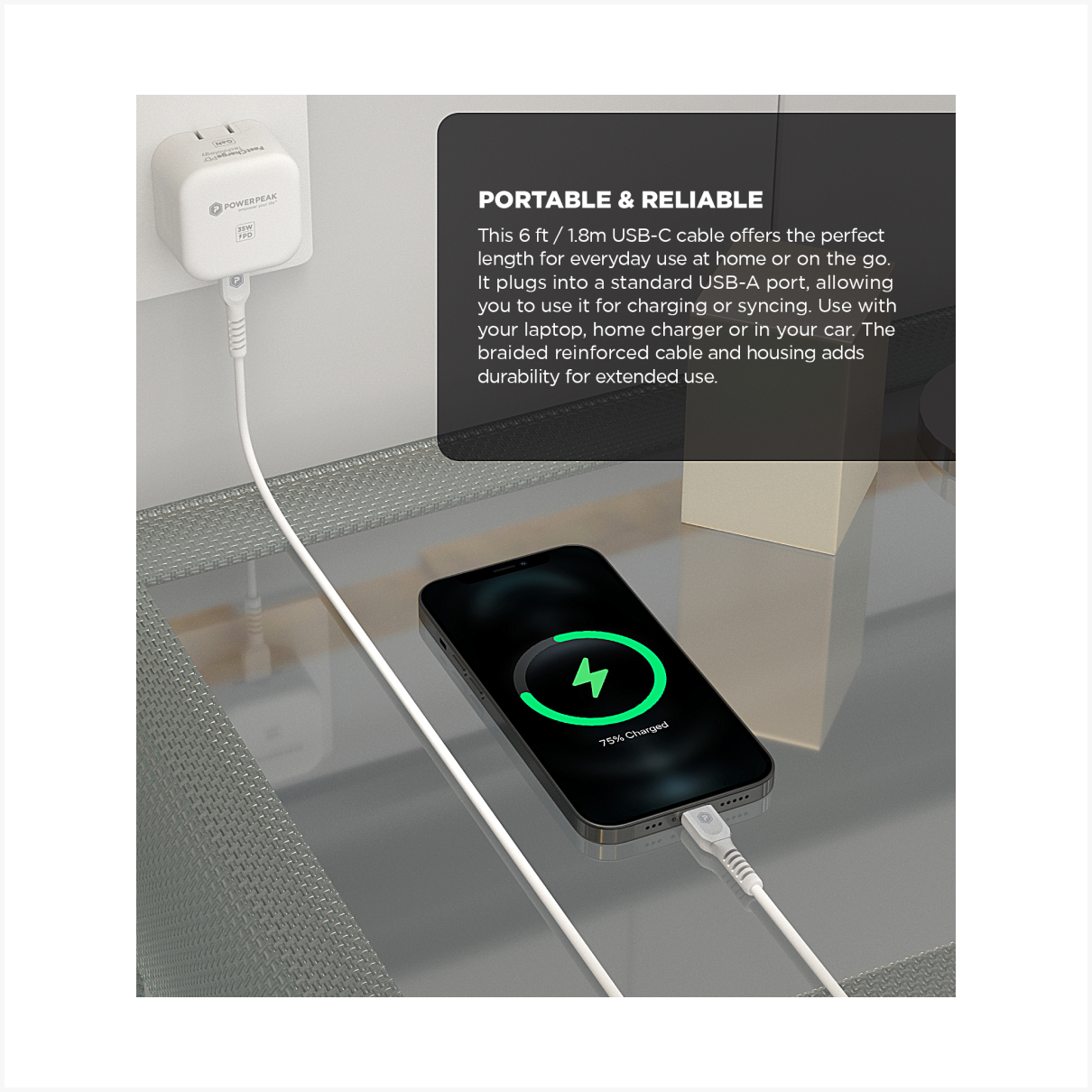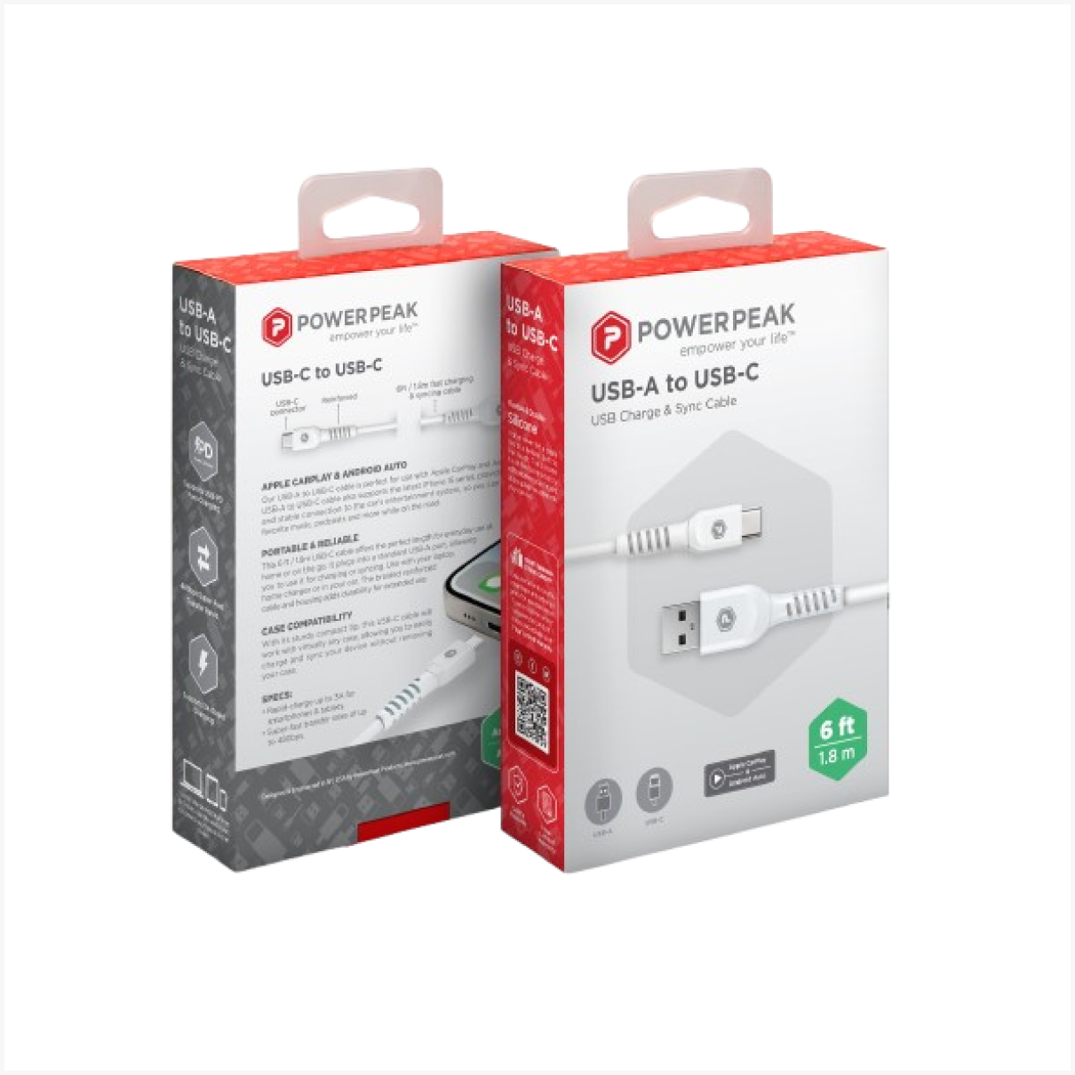 Power up and stay connected with the PowerPeak USB-A to Type-C Sync & Power Cable. Designed for reliability and durability, this 6-foot cable delivers high-speed charging and data transfer for all your USB-C devices. Whether you’re on the road using Apple CarPlay or charging at home, the sturdy construction ensures long-lasting performance. Its extended length offers added convenience, allowing you to reach from the wall to your desk or across your car without hassle. The crisp white design blends seamlessly with any environment, while compatibility with a wide range of devices makes it a must-have tech essential. Perfect for smartphones, tablets, and USB-C accessories, this cable is engineered for fast power delivery and flawless syncing. Don’t let low battery slow you down—PowerPeak keeps you moving.
